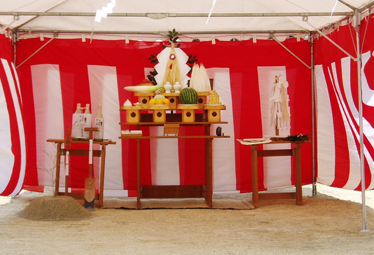 地鎮祭は、その土地の神様に建物を築する許しと施主の家内繁栄、工事の無事をお願いするものです。