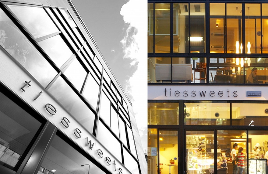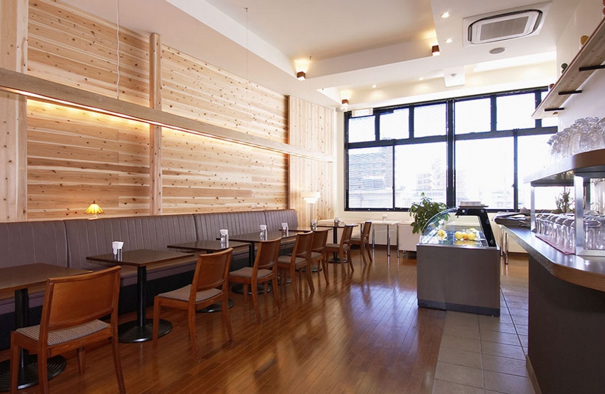 店舗建築施工例・ルジャンドル洋菓子長田店2F喫茶室 ●カベ:杉板貼り 一部EP塗り ●床:チークフローリング材(無垢材) 一部タイル貼り